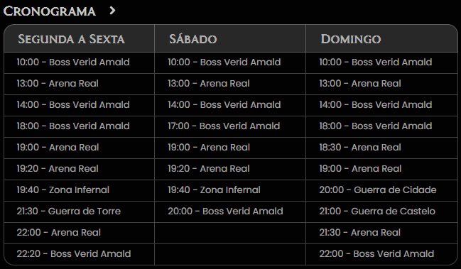 Últimas novidades Calendário de Junho Últimos Vídeos Youtube Cronograma Segunda a Sexta Sábado Domingo 10:00 - Boss Verid Amald 10:00 - Boss Verid Amald 10:00 - Boss Verid Amald 13:00 - Arena Real 13:00 - Arena Real 13:00 - Arena Real 14:00 - Boss Verid Amald 14:00 - Boss Verid Amald 14:00 - Boss Verid Amald 18:00 - Boss Verid Amald 17:00 - Boss Verid Amald 18:00 - Boss Verid Amald 19:00 - Arena Real 19:00 - Arena Real 18:30 - Arena Real 19:20 - Arena Real 19:20 - Arena Real 19:00 - Arena Real 19:40 - Zona Infernal 19:40 - Zona Infernal 20:00 - Guerra de Cidade 21:30 - Guerra de Torre 20:00 - Boss Verid Amald 21:00 - Guerra de Castelo 22:00 - Arena Real 21:30 - Arena Real 22:20 - Boss Verid Amald 22:00 - Boss Verid Amald Cidades Rank Top Level Inicie agora com Equipamentos Poderosos! Bosses - Universe of Kersef Mídias Sociais Siga-nos para receber sempre nossas novidades! JUNTE-SE À BATALHA JOGUE GRÁTIS