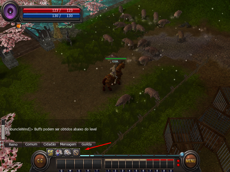 [Controle de Combate] Você pode escolher o controle de combate físico clicando no botao C.C. e a personagem irá automaticamente as usar todas as skills de Buff da primeira barra rápida e o personagem irá atacar fisicamente todos os monstros que estiverem dentro do seu raio de ataque. |
