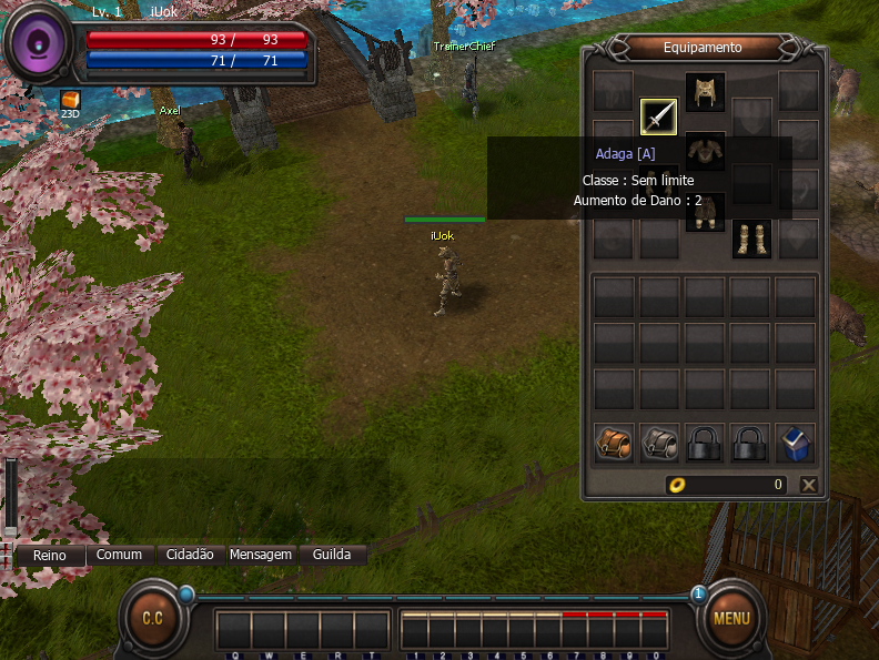 Agora, abra seu inventário pressionando a tecla “I” – e você encontrará uma arma. Equipe-a no slot que se encontra ao lado do elmo.
